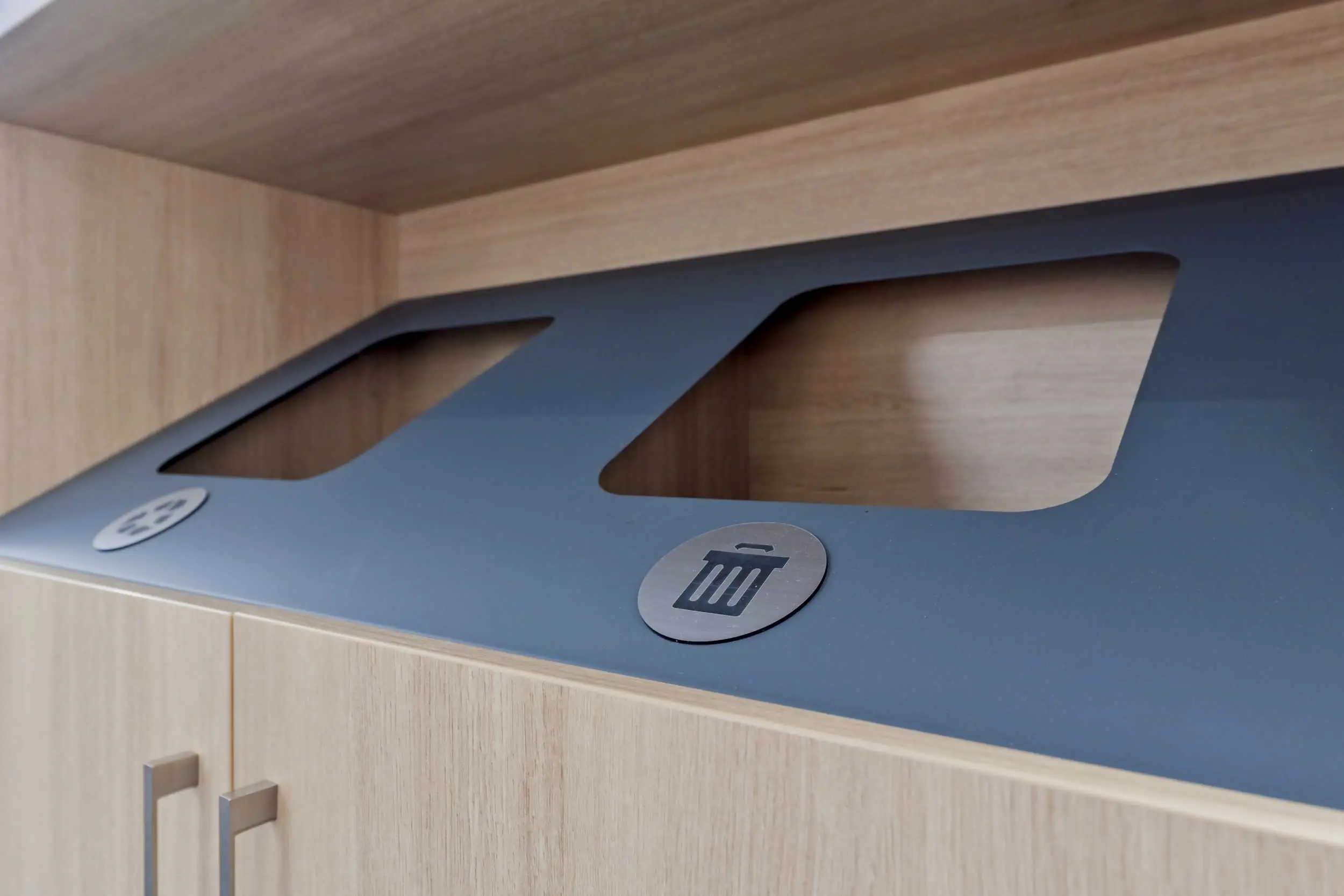 The combined use of melamine, laminate, polymer, and corian creates an environment that is both modern, durable, and functional.