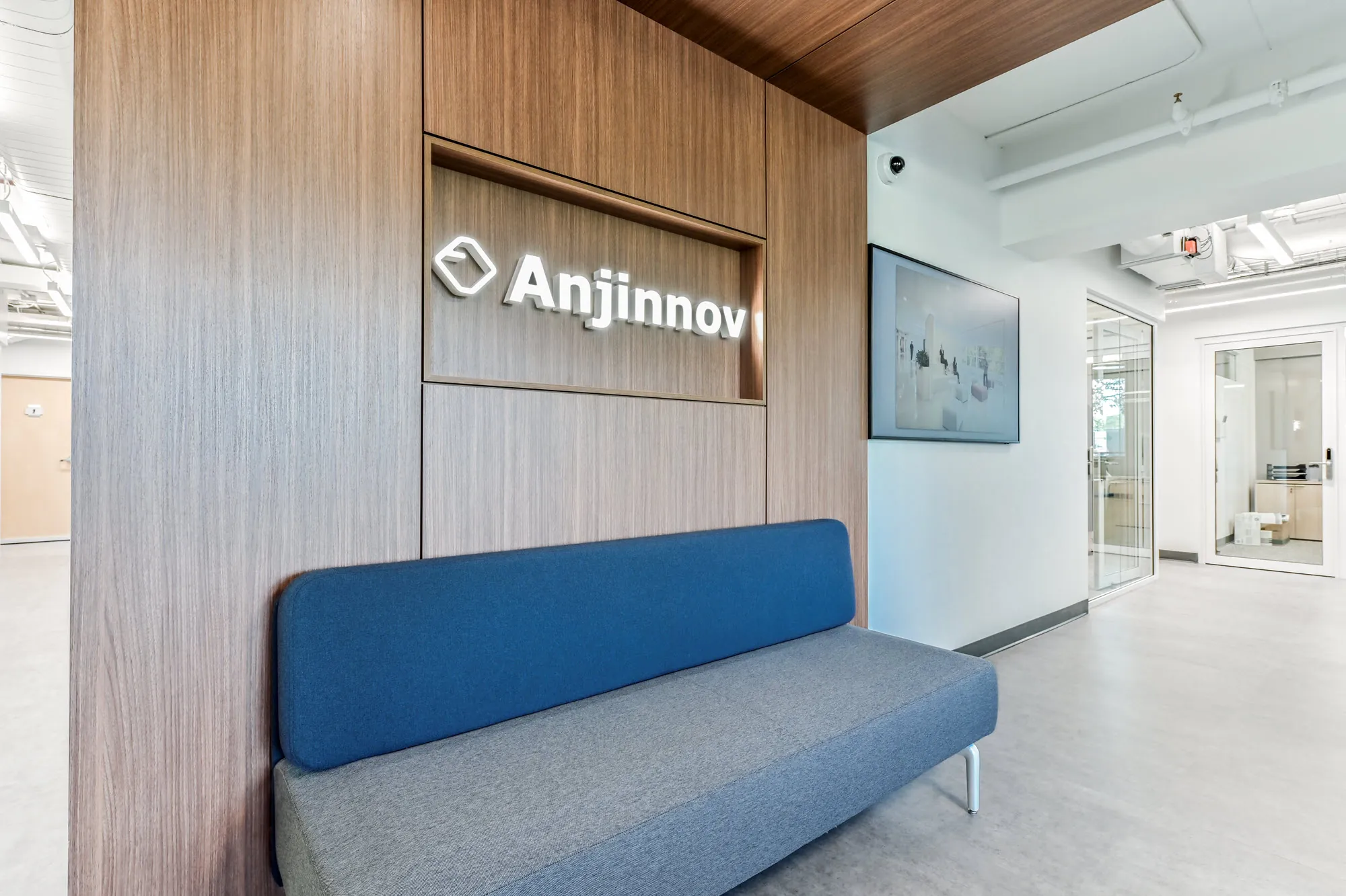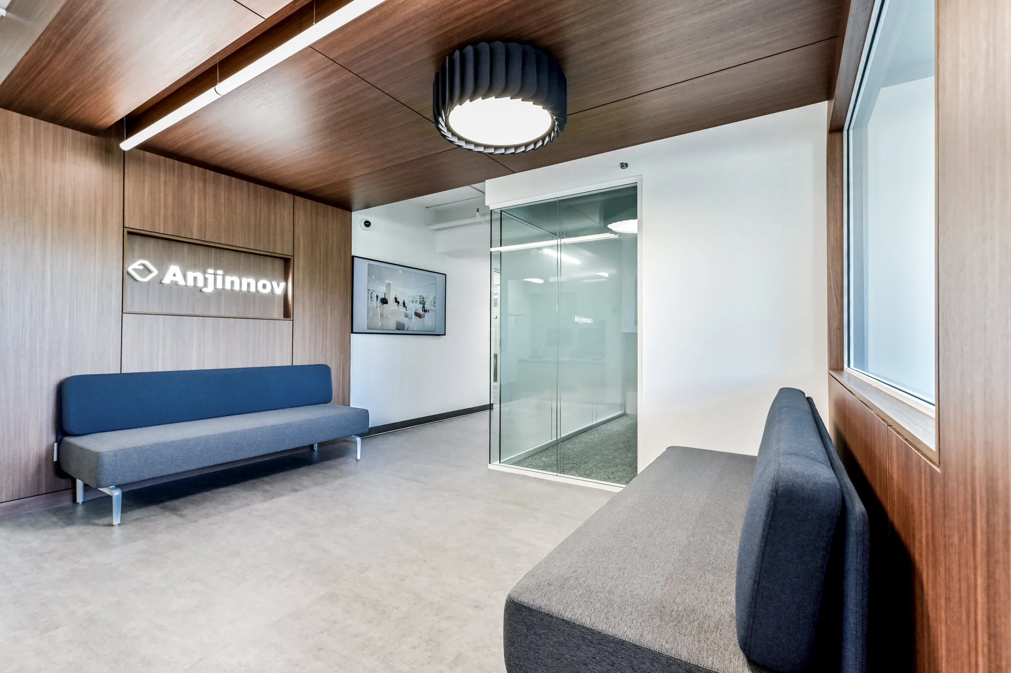 The reception area of Construction Anjinnov was designed as a welcoming space that reflects the company’s professional image.