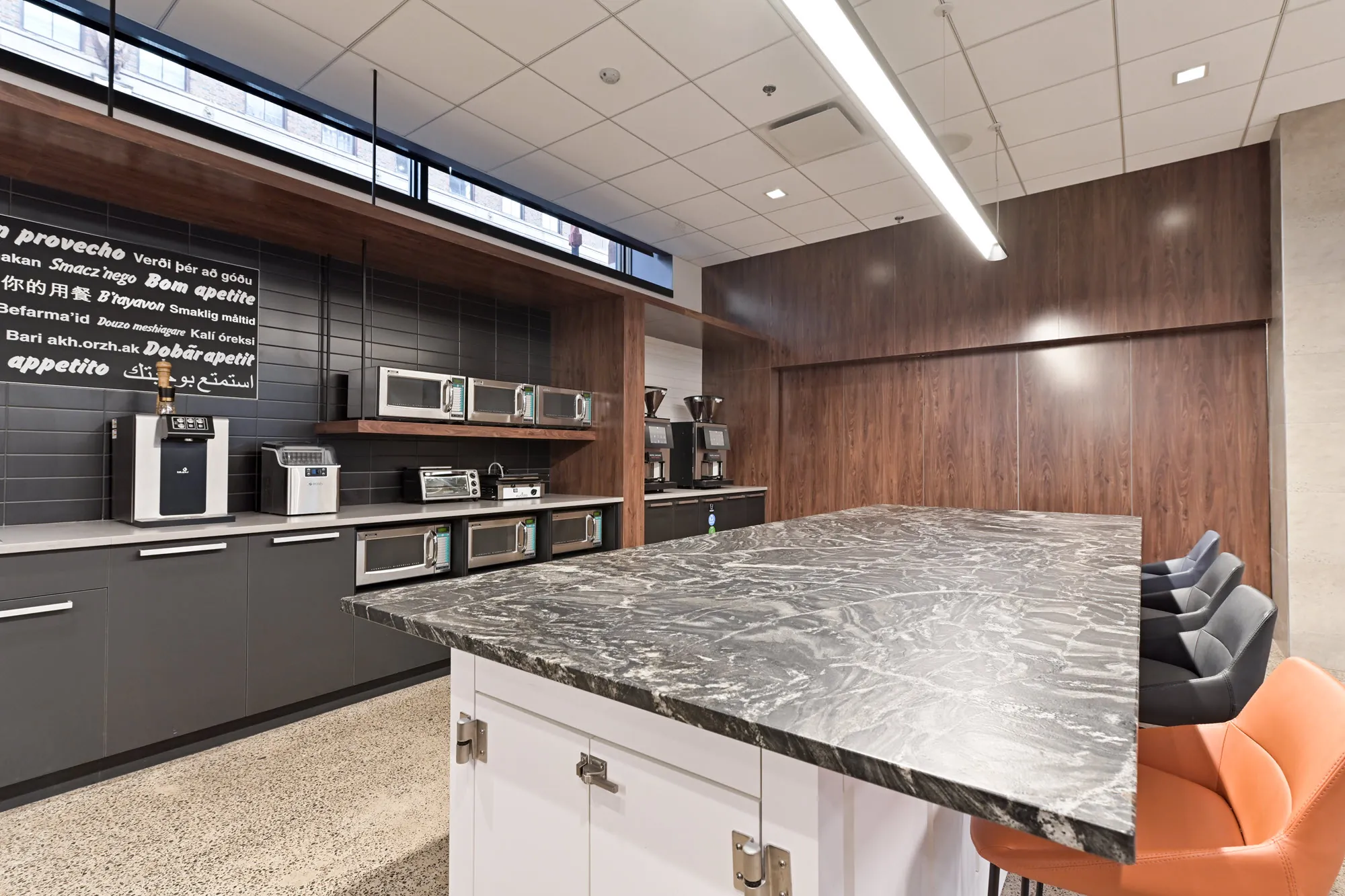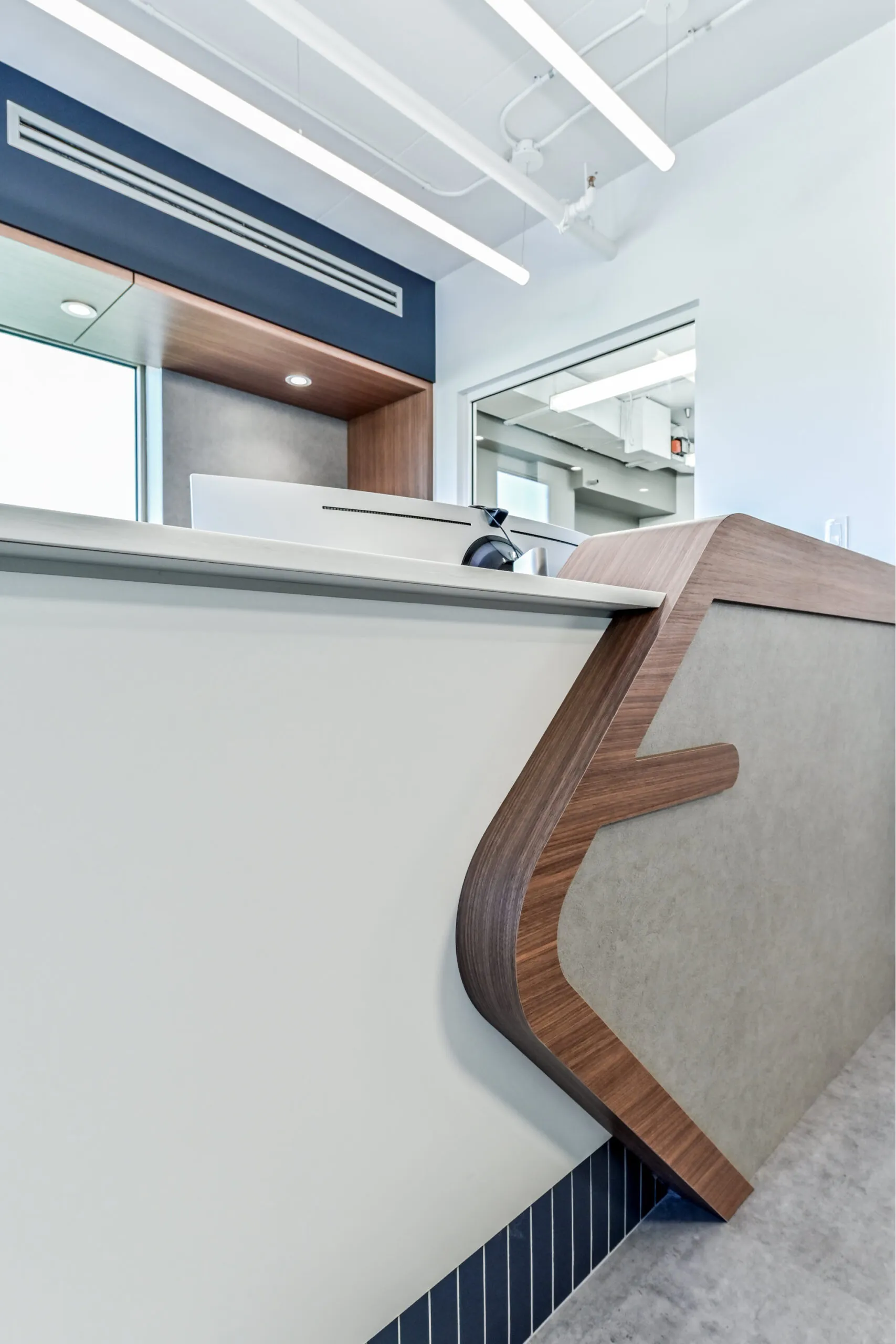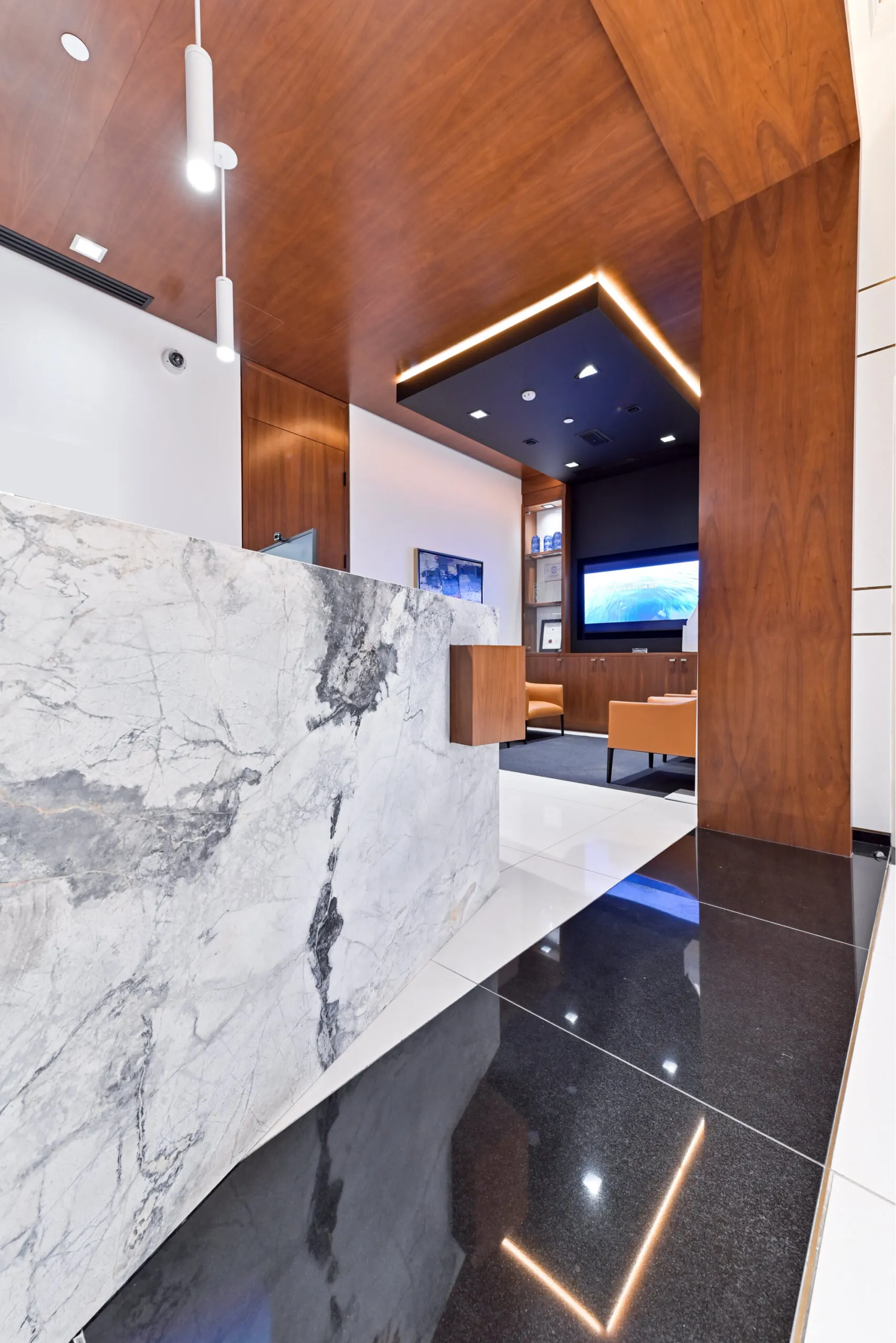 This corporate space was designed to be both functional and elegant, showcasing the diversity of custom millwork elements.