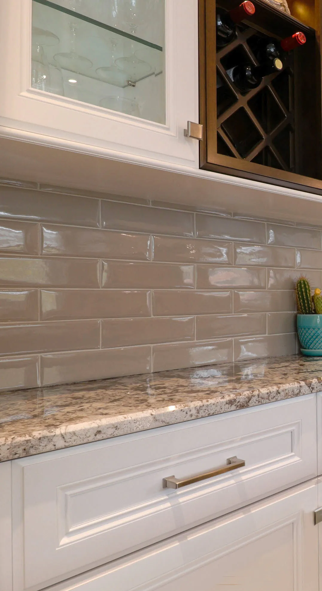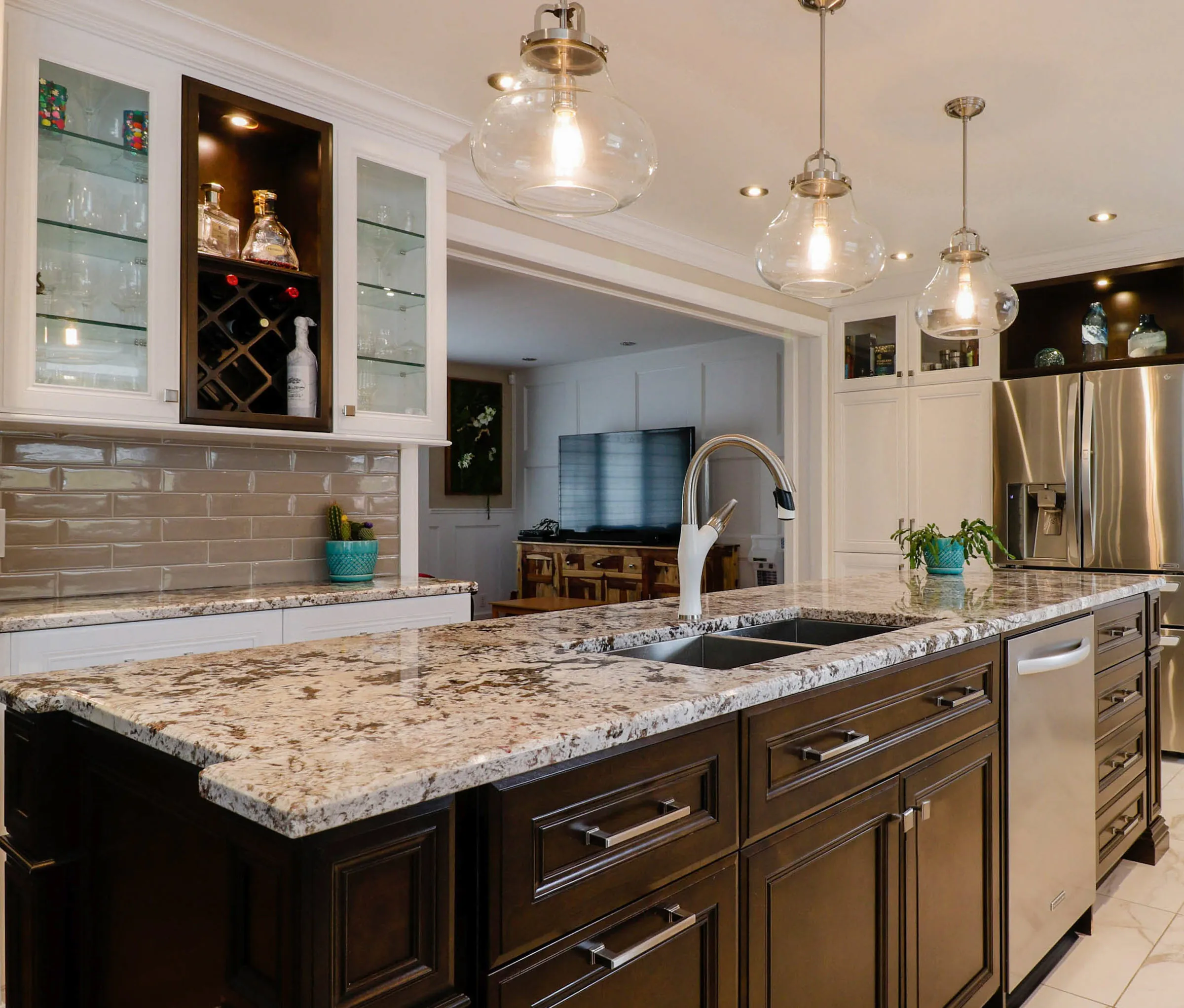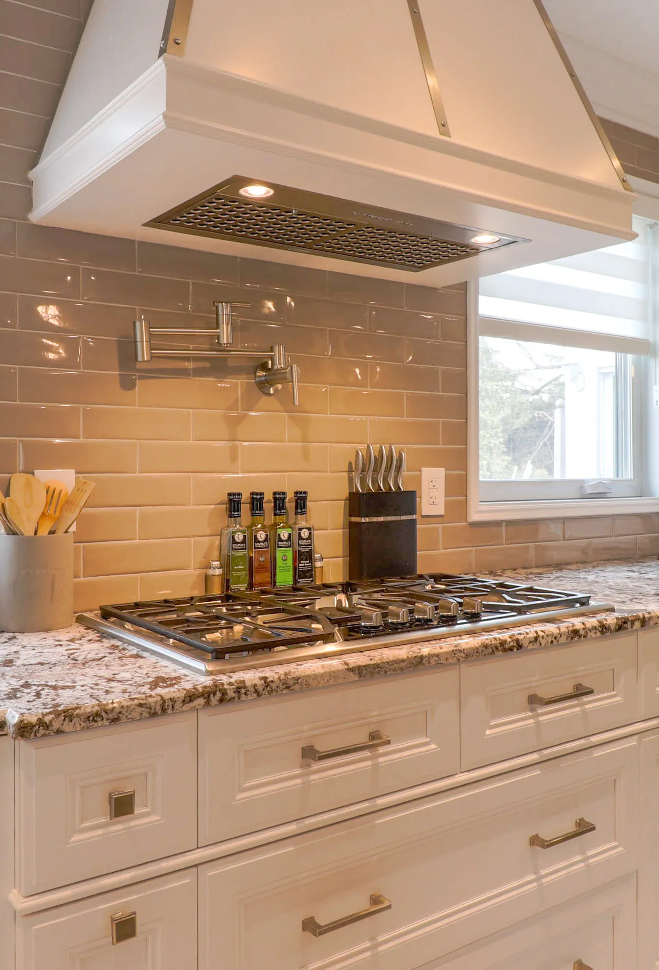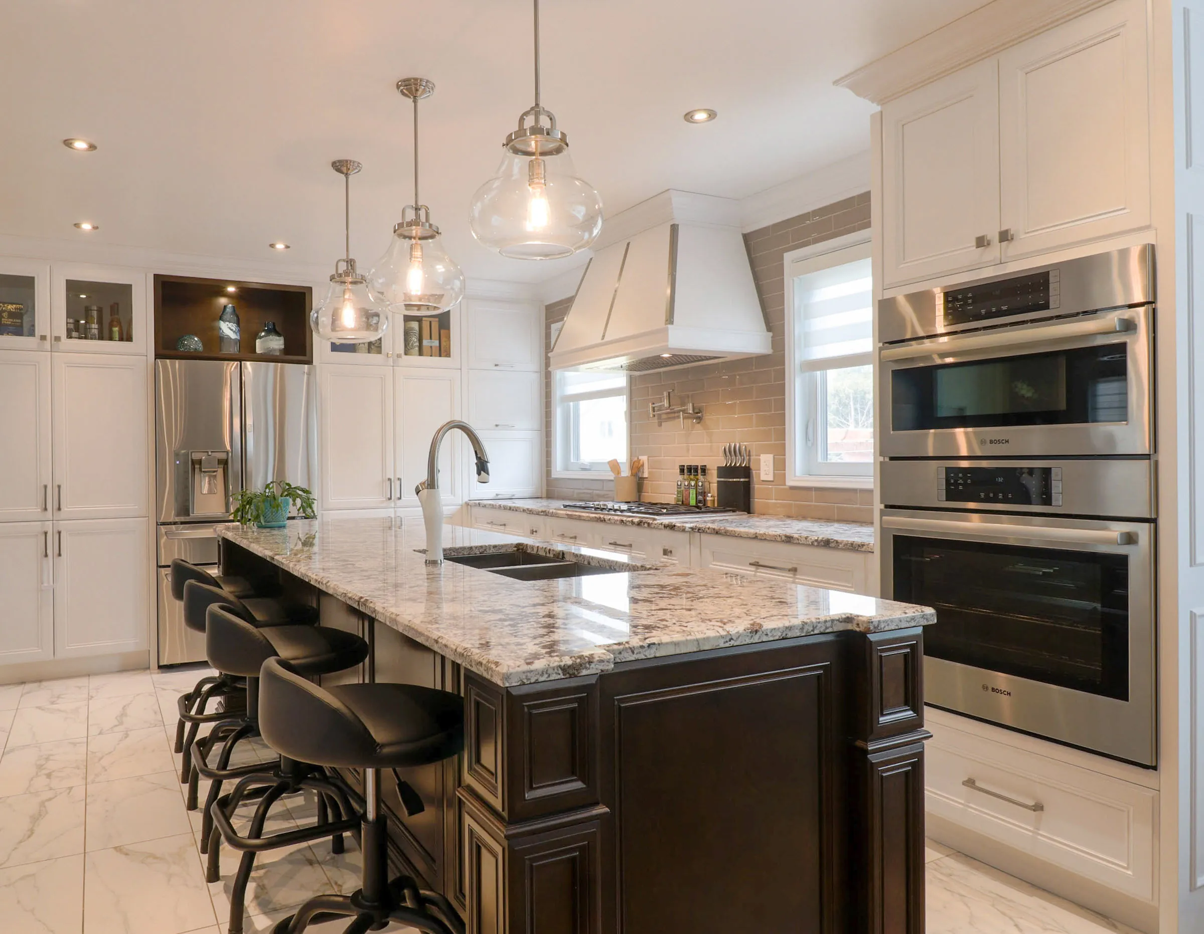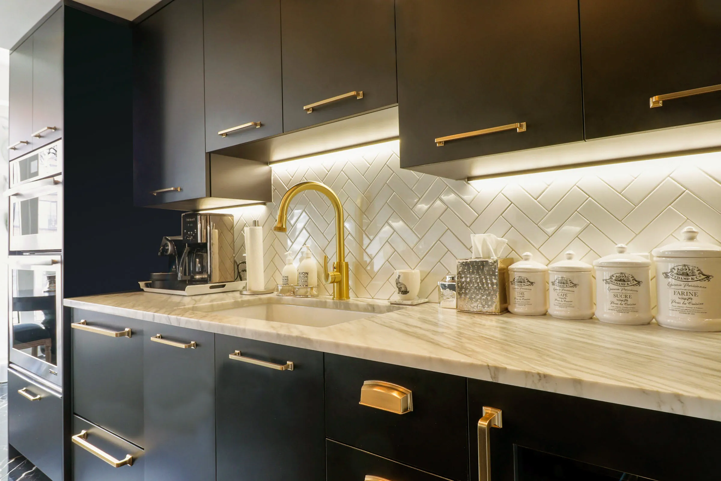 Les comptoirs effet marbre, choisis avec soin, témoignent d’un goût affirmé pour l’élégance intemporelle.