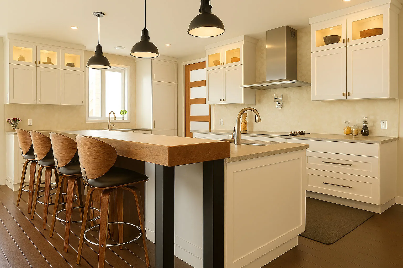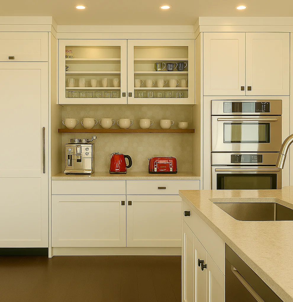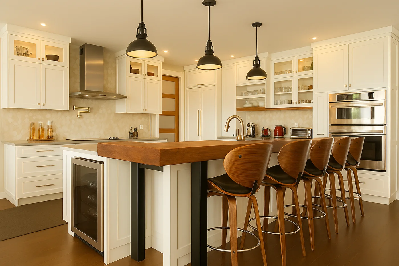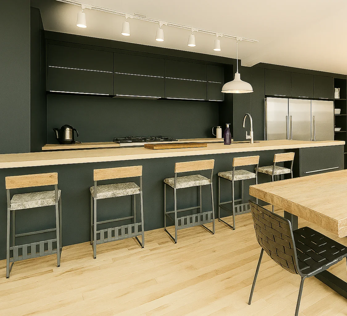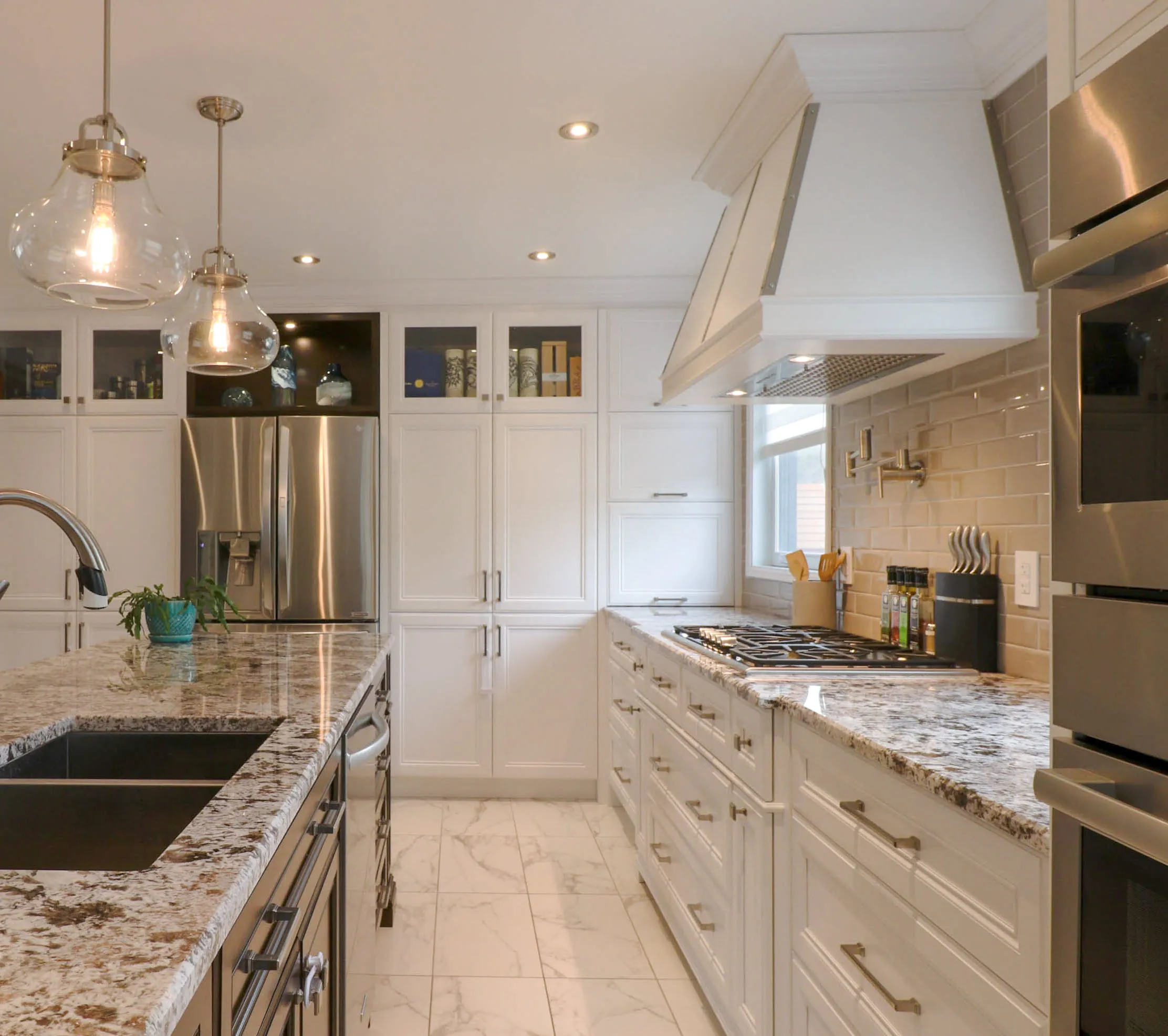 Les comptoirs effet marbre, choisis avec soin, témoignent d’un goût affirmé pour l’élégance intemporelle.