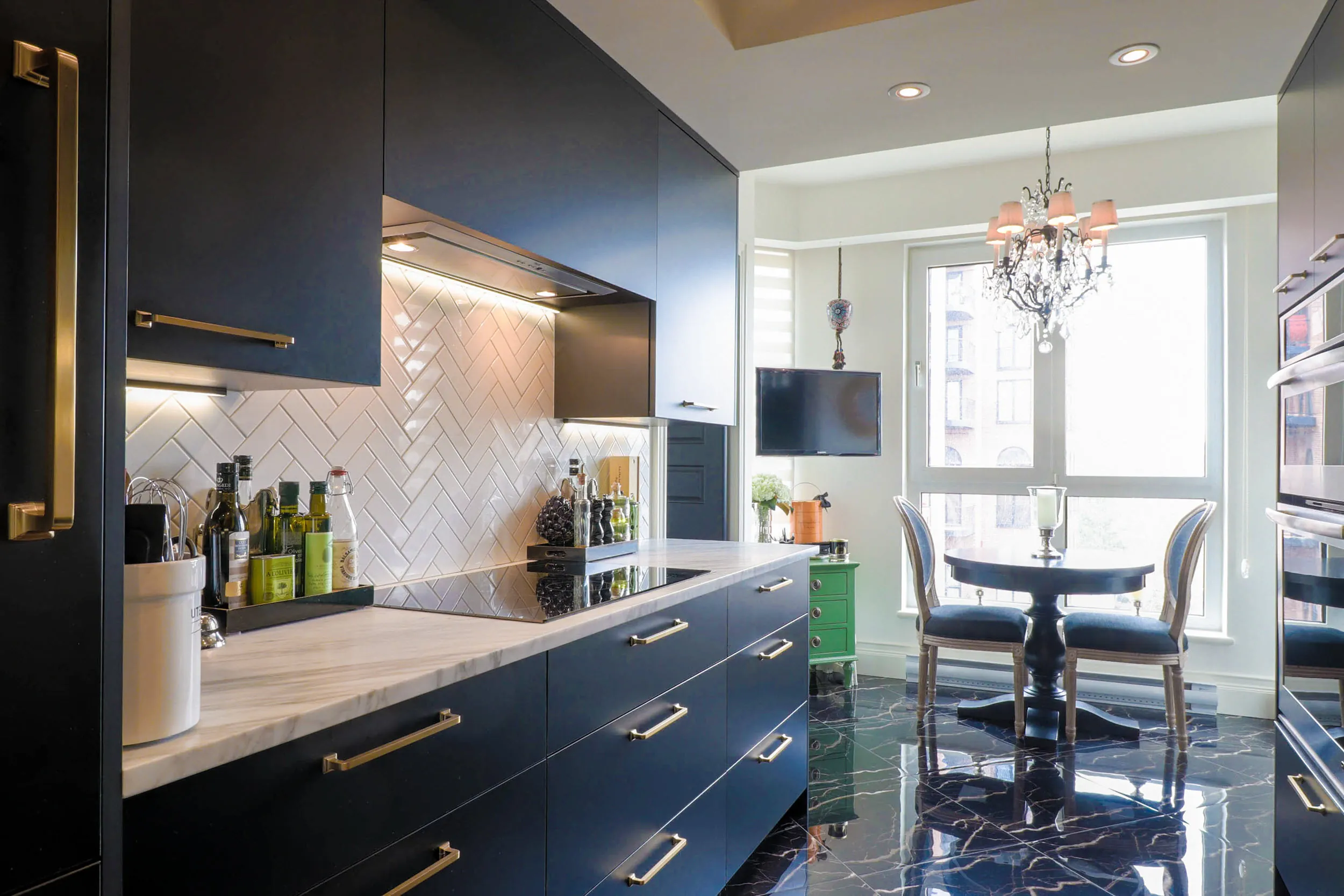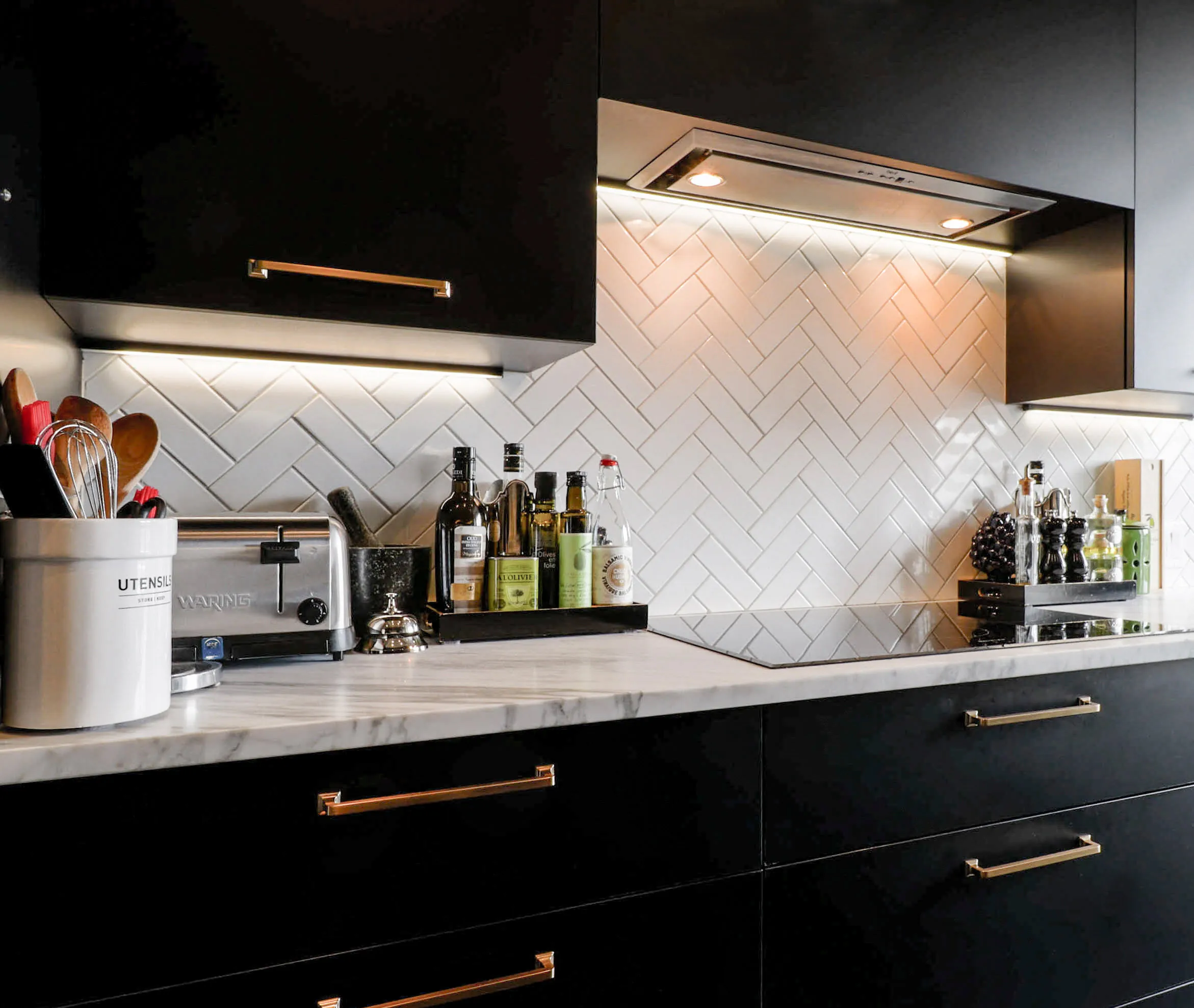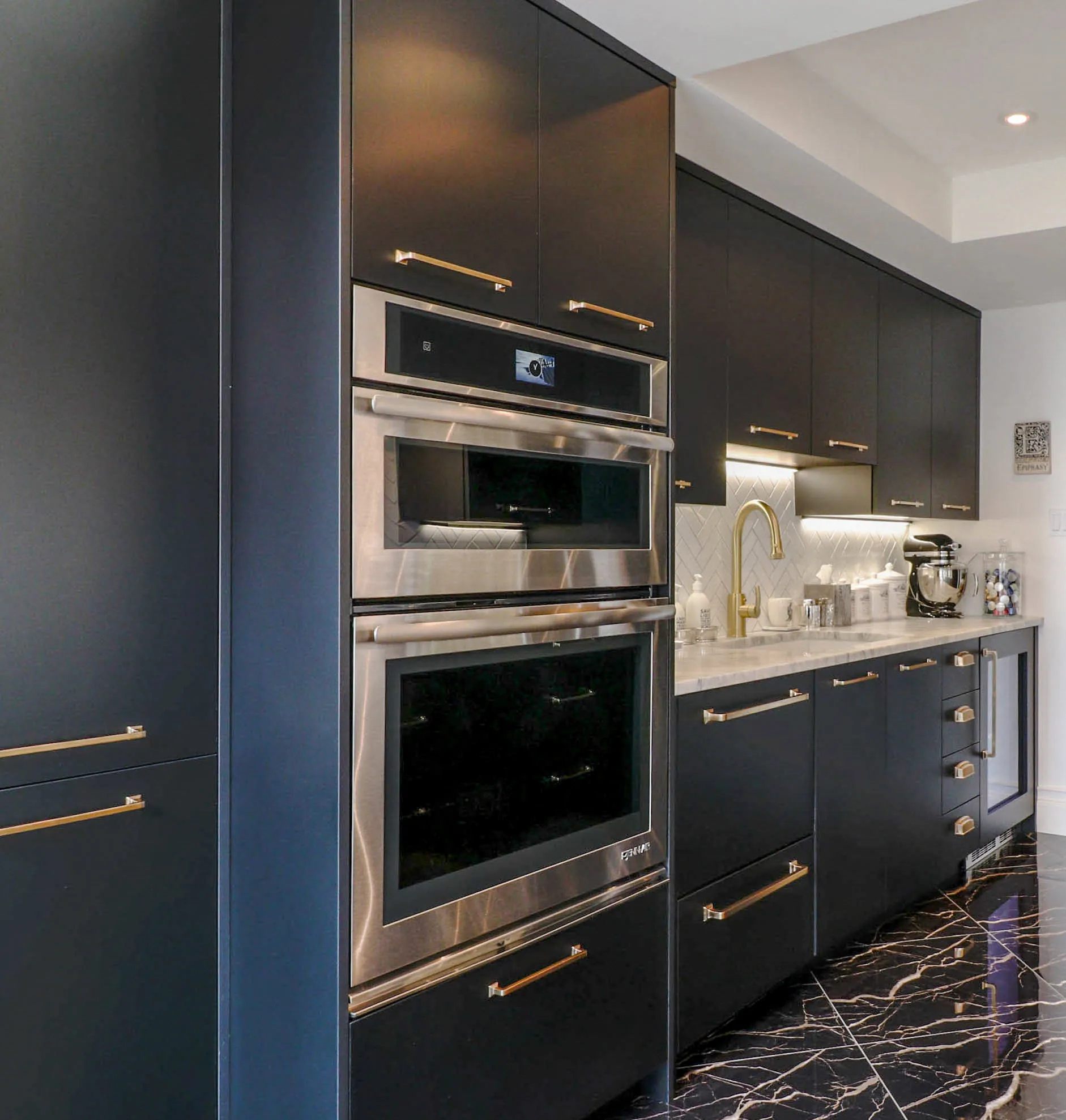 Dès l’entrée, la cuisine impose son style : un espace distingué, entièrement vêtu de noir et sublimé par des quincailleries dorées qui apportent une touche de sophistication.
