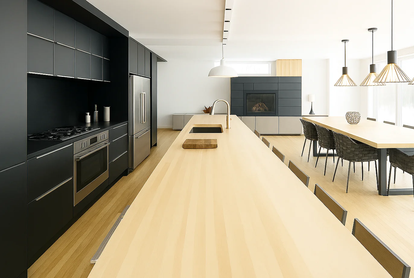 Seule une designer pouvait oser ce matériau dans une cuisine, parfaitement consciente de ses propriétés et attentive à en préserver la beauté pour assurer une durabilité accrue.